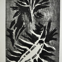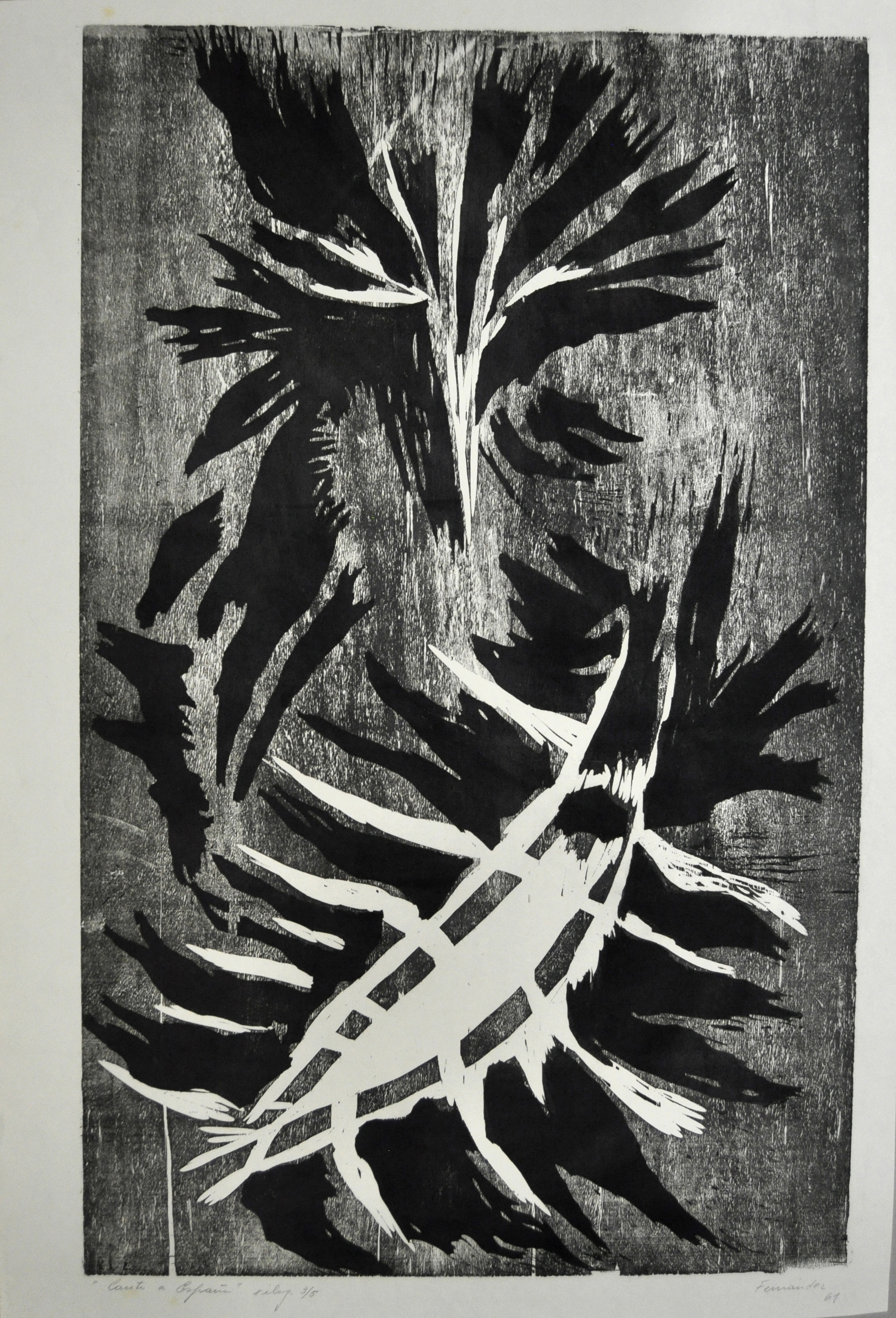 - Xilografía en negro. Formas abstractas en blando con manchas en negro saliendo hacia los lados y fondo negro