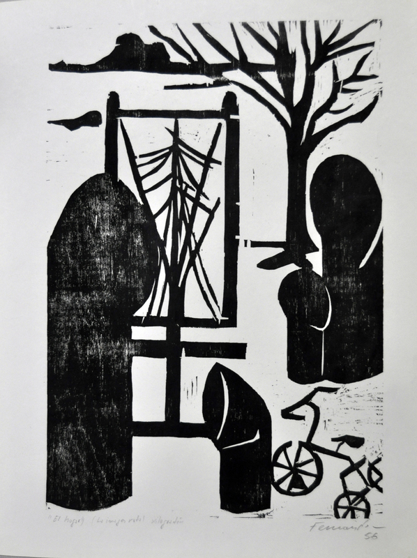 Xilografía en negro con chimeneas y triciclo, y arboles y atril atrás.