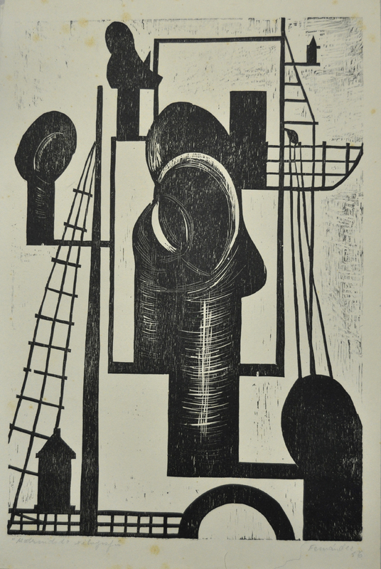 Xilografía en negro chimenea con paisaje marino, en forma abstracta